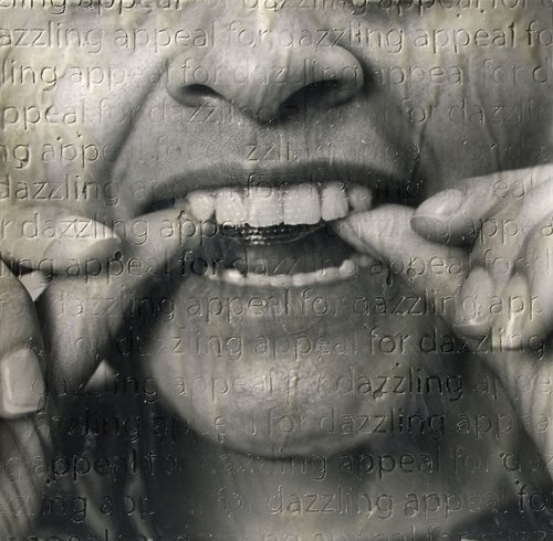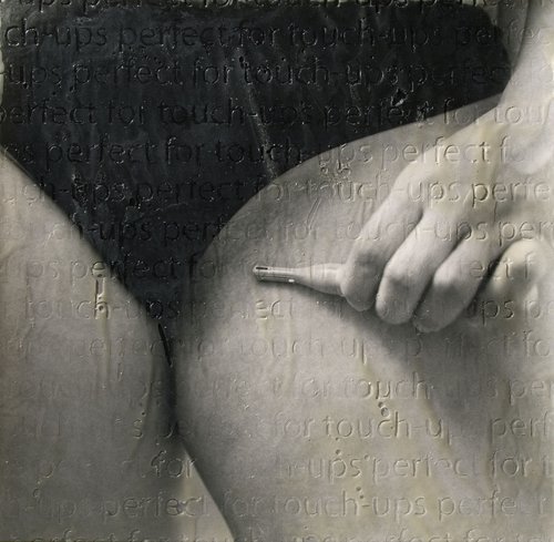 It is intended that the viewer will experience a sense of familiarity among the images of women practicing beauty rituals through the use of the products depicted and the advertising text that is repeated. This body of work consists of black and white, photographic images with appropriated text carved into wax that is painted onto the surface.
