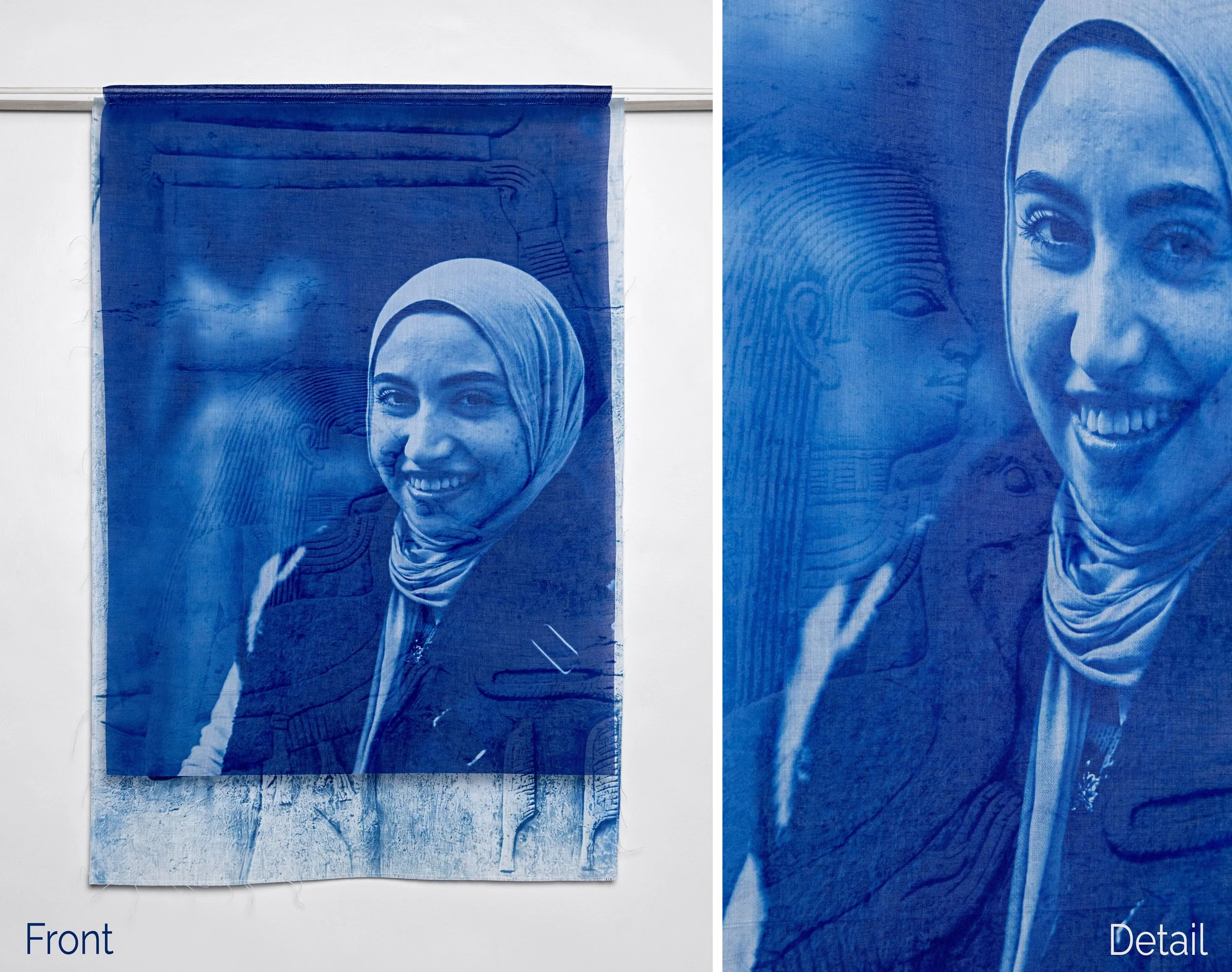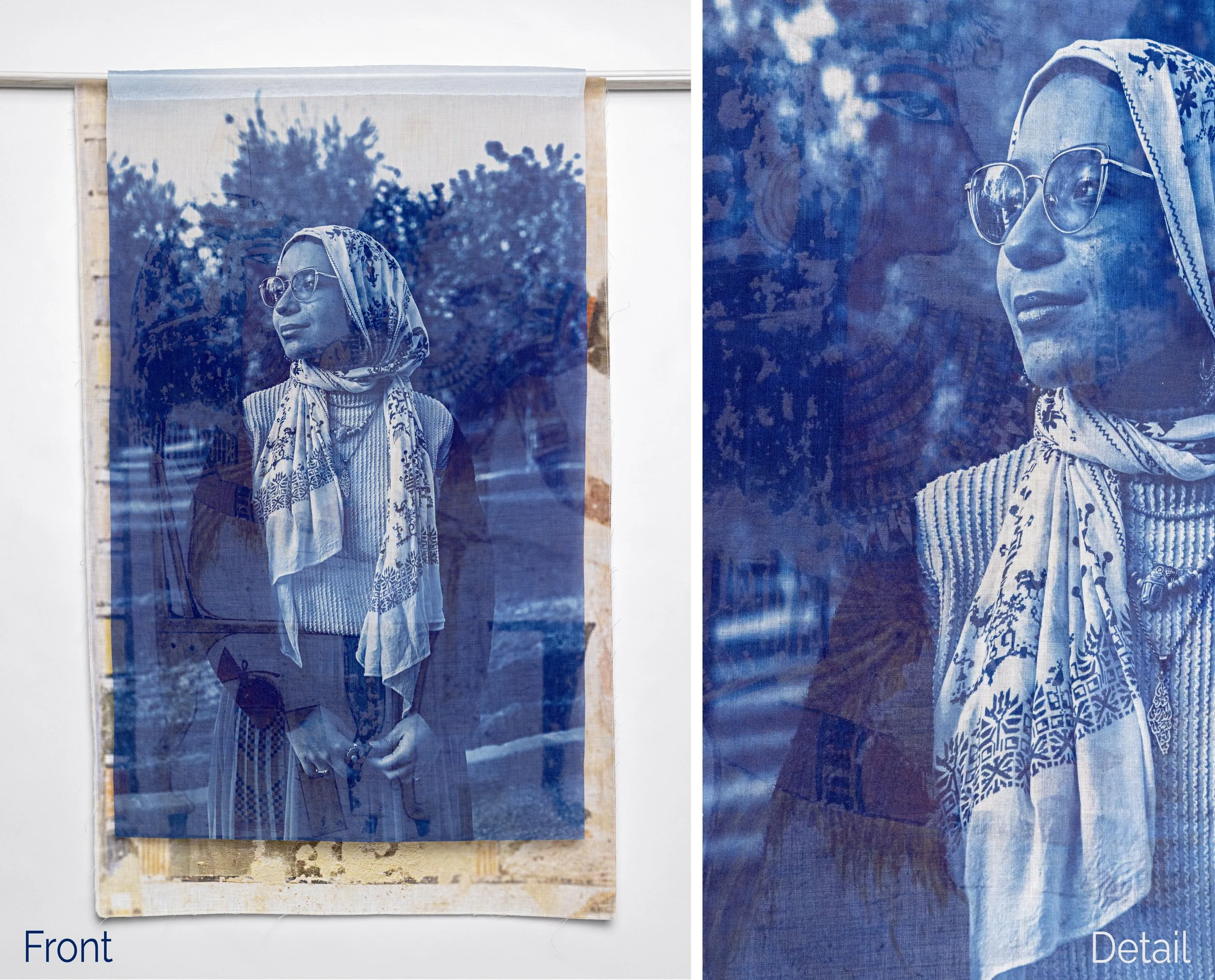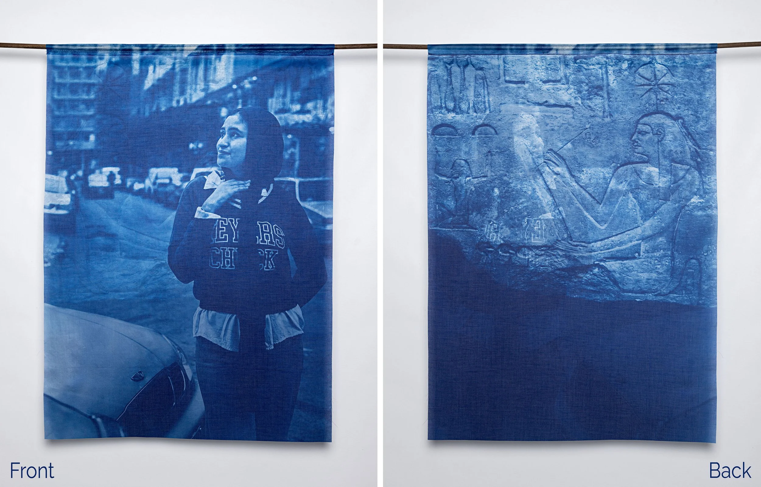Rahma + Mut, 2025, Double-sided cyanotype on cotton organdy, 26.5” x 19.5”
