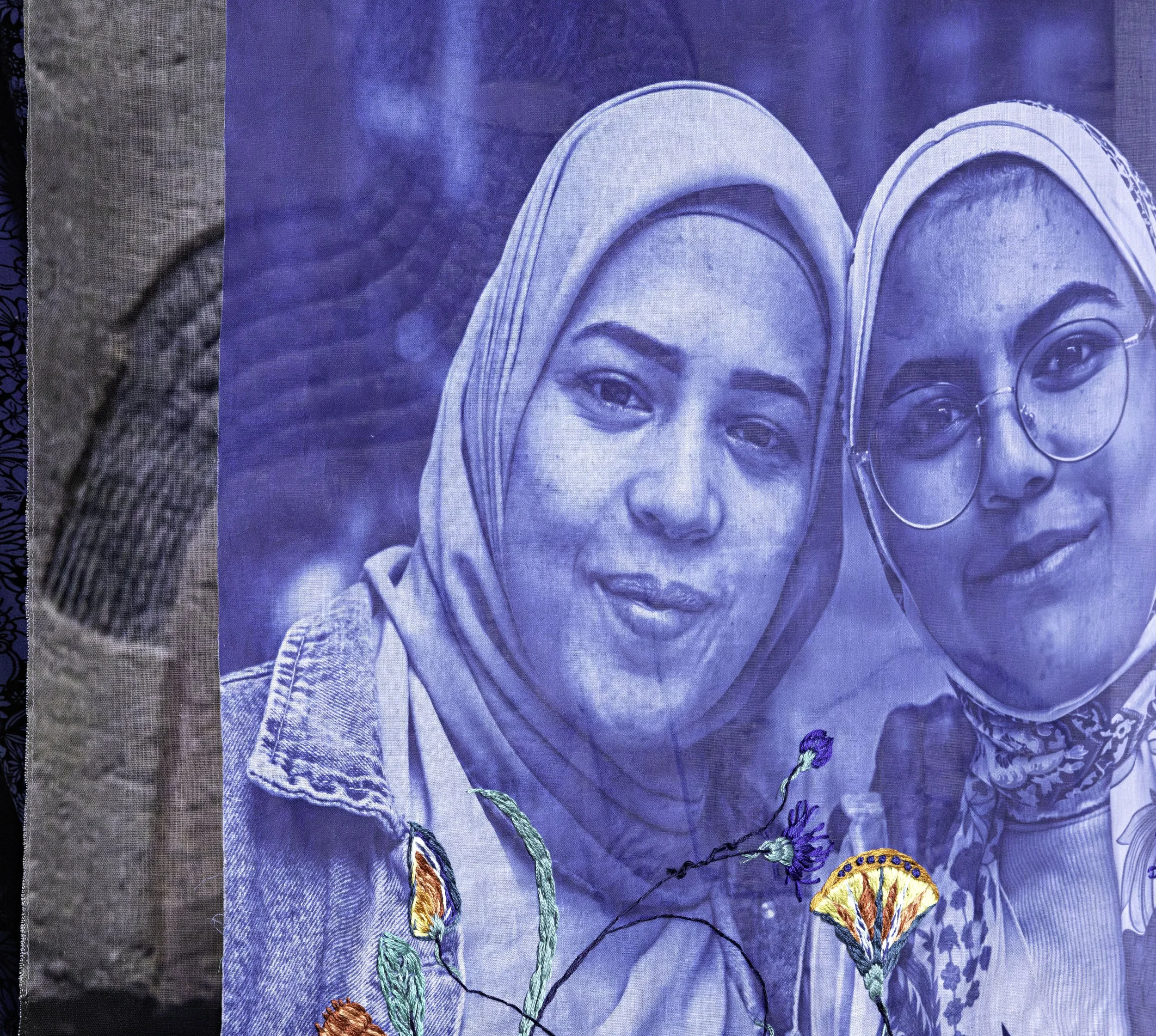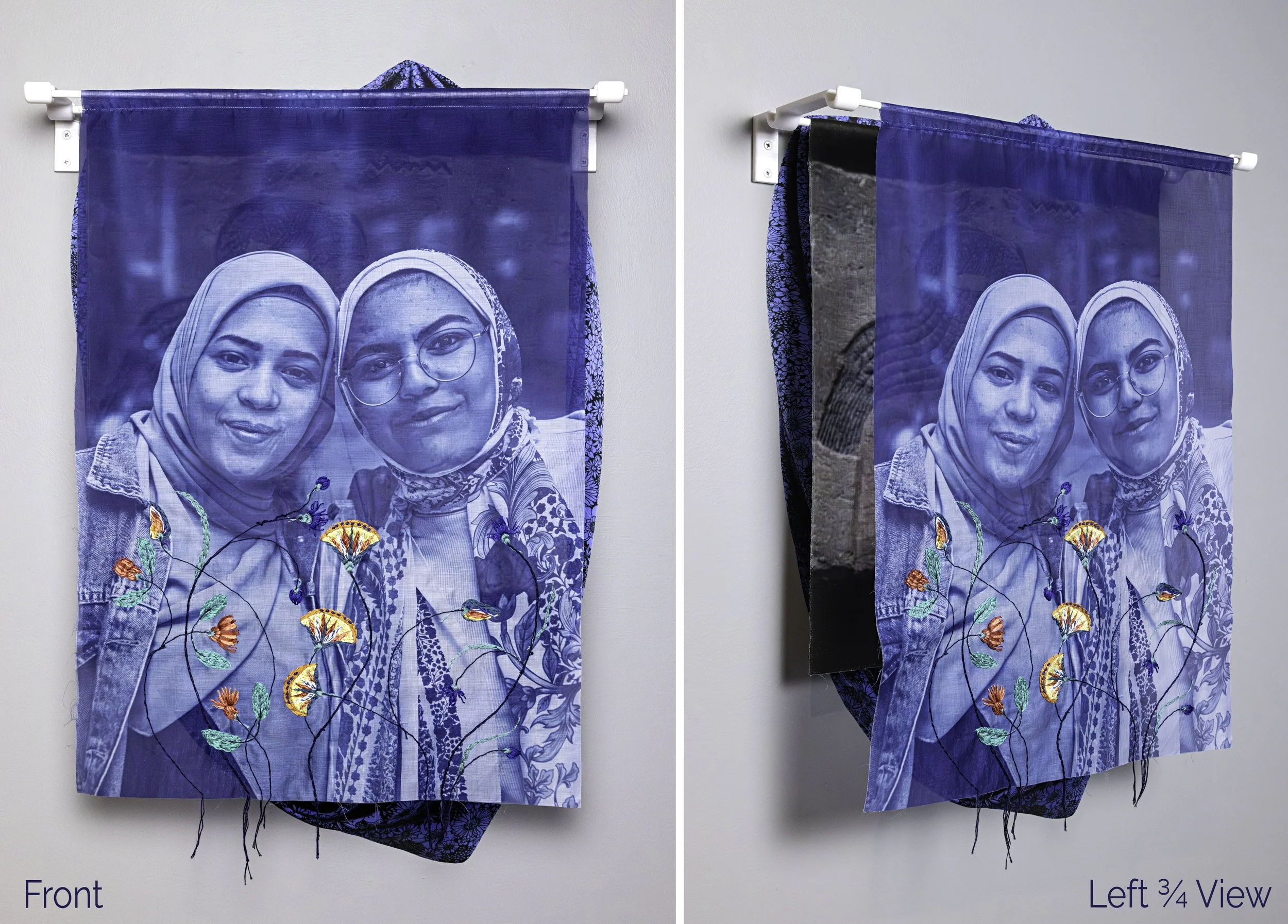 Sisters (Nada & Manar) + Amarna Princesses, Cyanotype with hand embroidery on cotton organdy, pigment on linen, and pigment on adhesive fabric, 2025, 33” x 22” x 6.5”