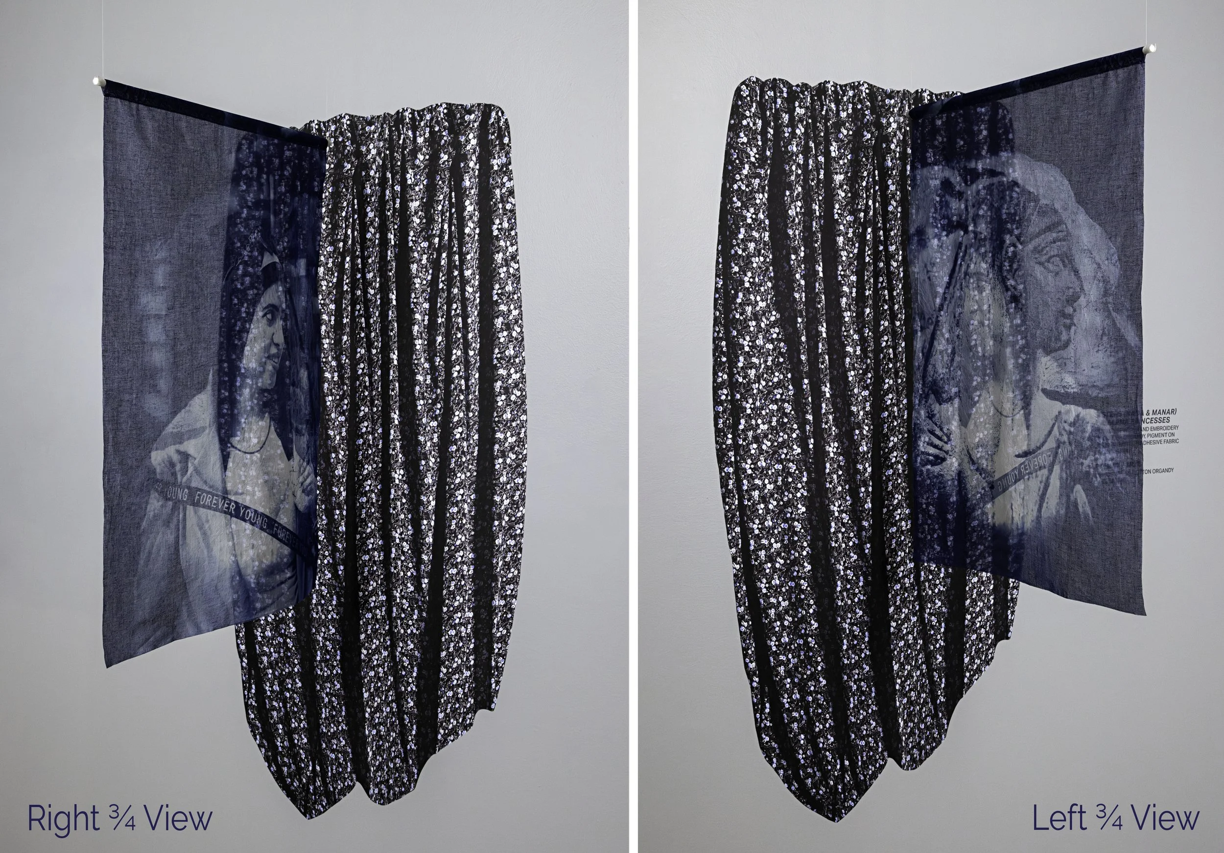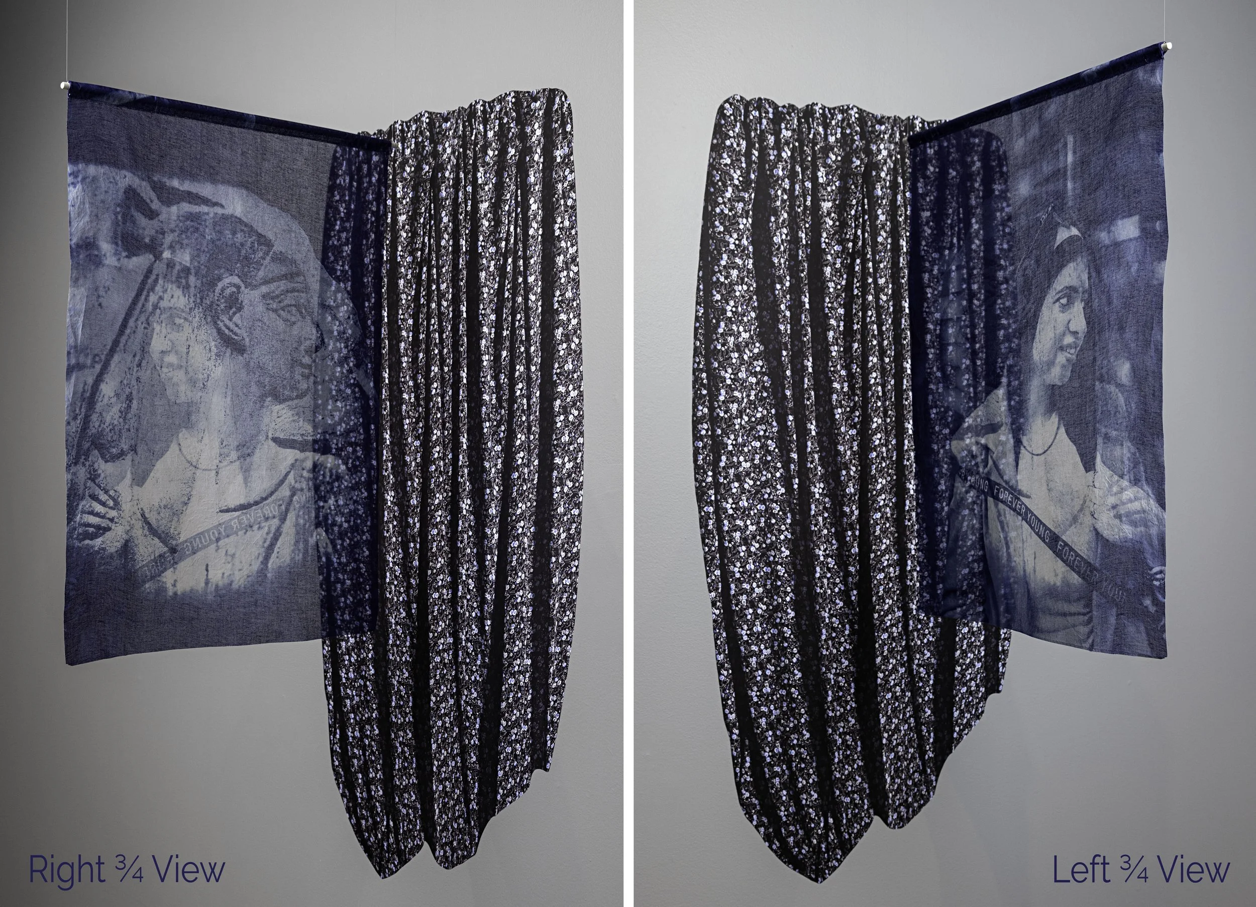 Rahma + Mut, 2025, Double-sided cyanotype on cotton organdy and pigment on adhesive fabric, 44” x 23” x 24”