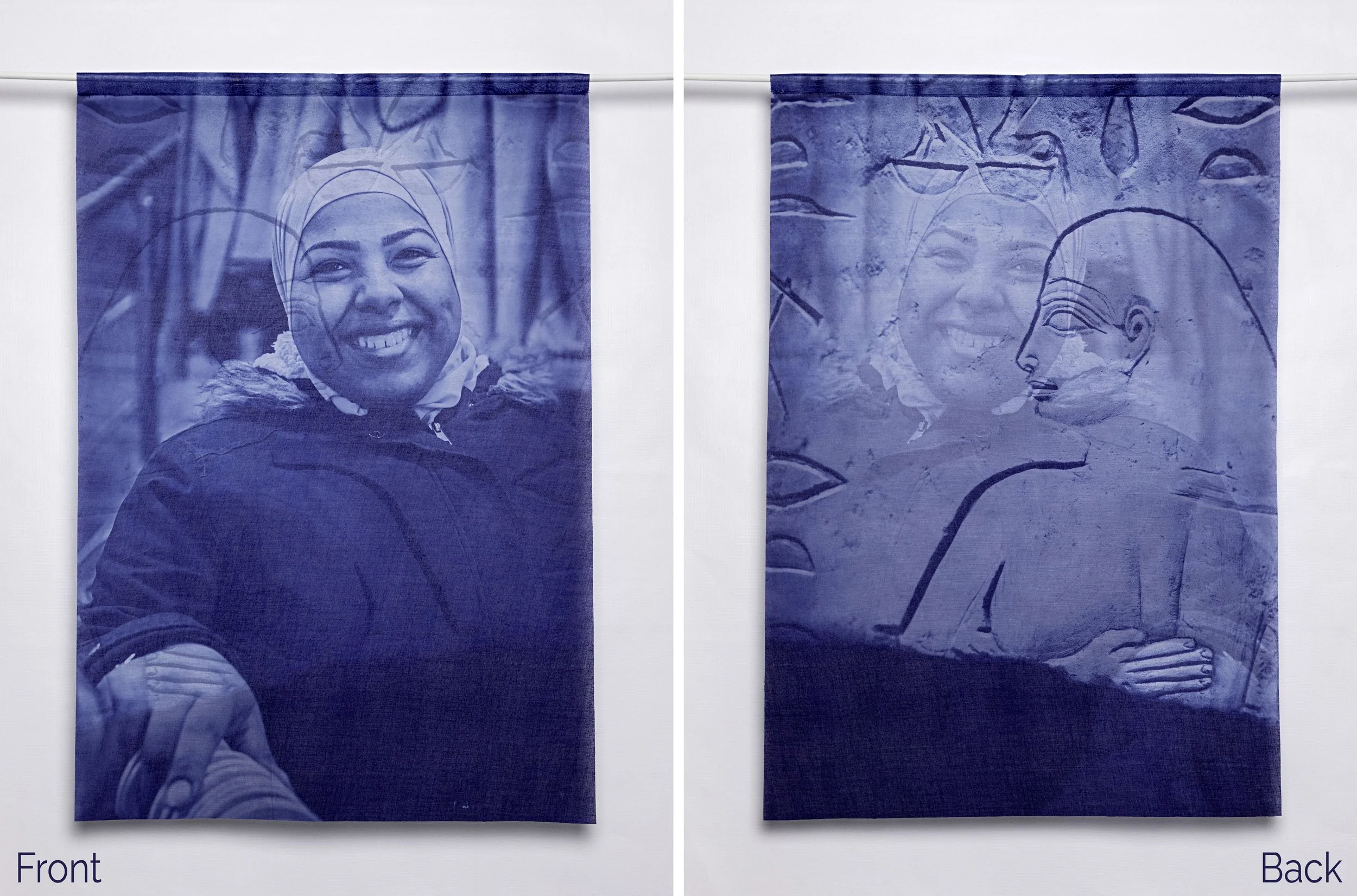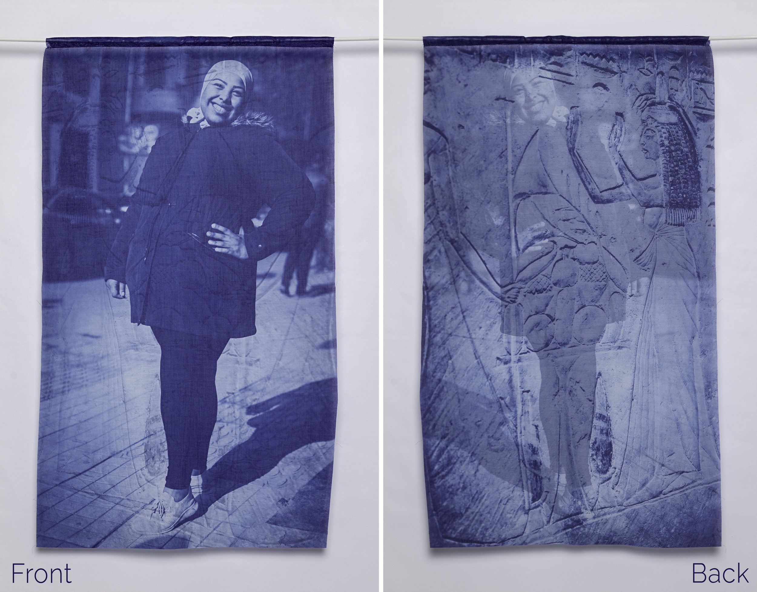 Amena + Khekeret, 2025, Double-sided cyanotype on cotton organdy, 26” x 18”