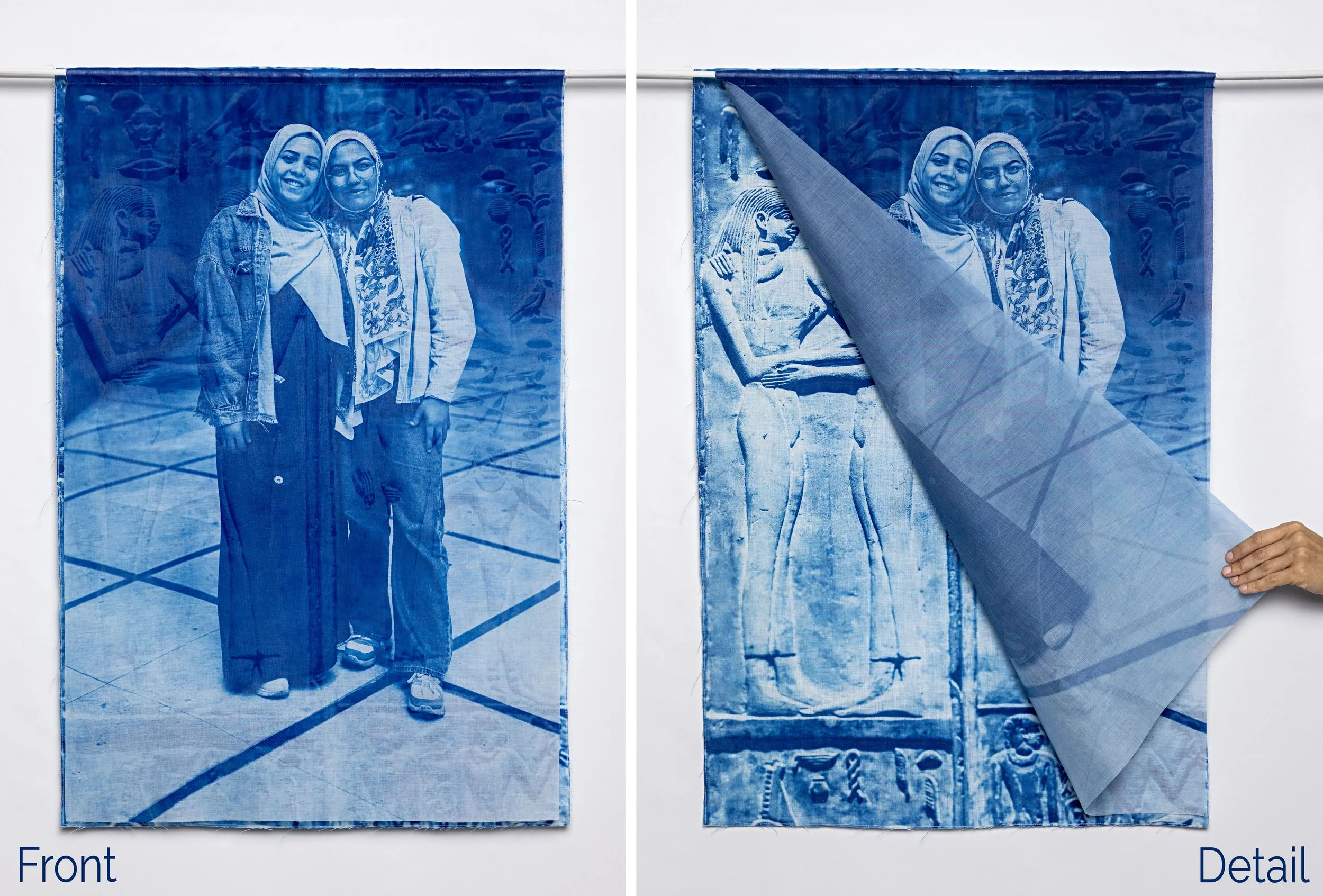 Sisters (Nada & Manar) + Ikhat, 2025, Double-sided cyanotype on cotton organdy & linen, 34” x 22.5”